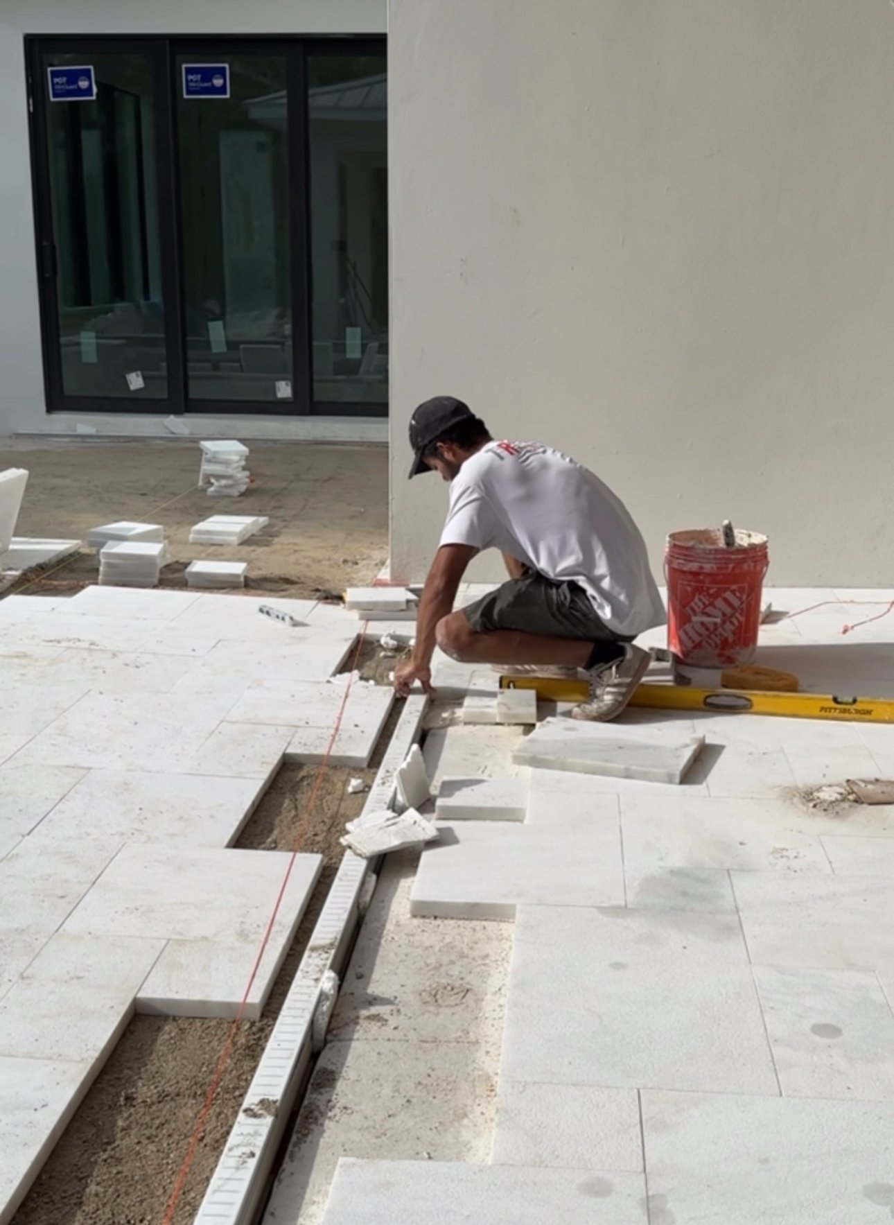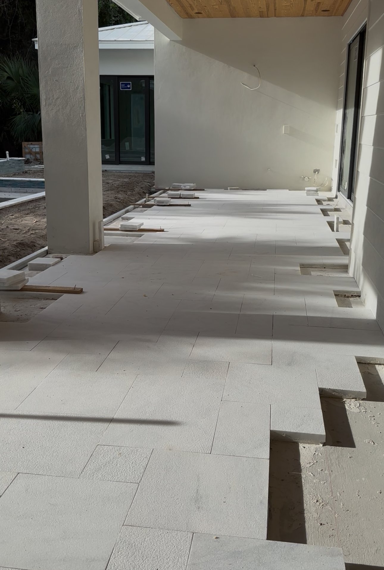 Professional tile installation using large-format porcelain tiles.